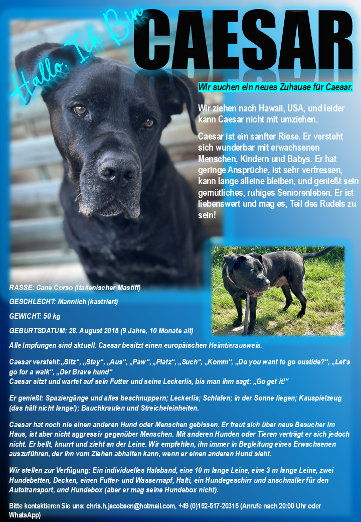 Conner wurde von engagierten Tierschützern aus schlechter Haltung befreit und dann an eine Familie vermittelt. Nach wenigen Monaten wurde er jedoch, wegen der Erkrankung eines Familienmitgliedes zurückgebracht. Seit Mai 2024 ist er in einer Hundepension im LK Tuttlingen untergebracht, wo wir ihn freundlich, unkompliziert und verträglich kennengelernt haben. Aktuell lebt er in einer Gruppe mit 5-7 Hunden zusammen. (Conner verträgt sich nicht mit unkastrierten Rüden) Conner, unser „Riesenbaby“ ist sehr anhänglich und menschenbezogen. Wir suchen für ihn ein Zuhause mit vollem Familienanschluss und mit einem sicher eingezäunten Garten. Kinder sollten schon älter und standfest sein.