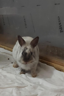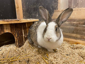 Rasse: Rexkaninchen (grau), Zwergkaninchen (weiß/braun)