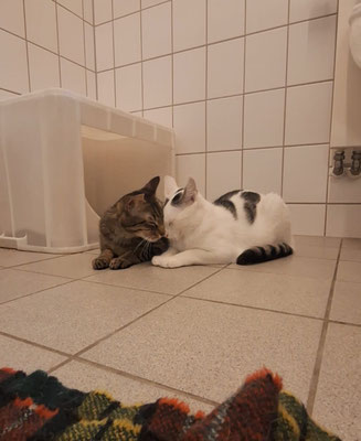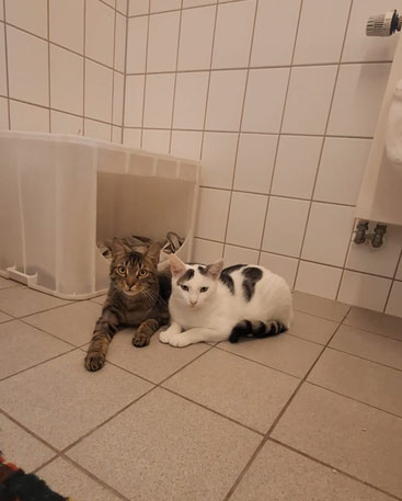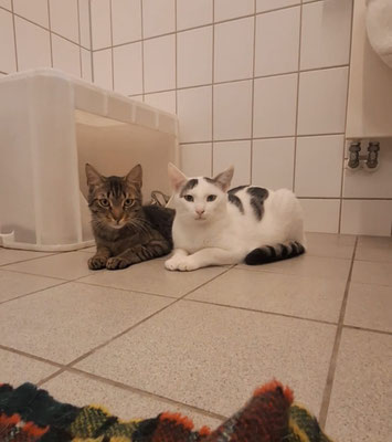 Die zwei müssen nicht gemeinsam vermittelt werden, verstehen sich jedoch sehr gut miteinander und sind auch sehr sozial im Umgang mit anderen Katzen. Eine bereits vorhandene, verträgliche Katze im neuen Zuhause wäre für alle eine schöne Bereicherung. Der Altersunterschied sollte dabei nicht zu groß sein. Kleine Kinder sind in ihrem neuen Zuhause allerdings nicht ideal. Zu Beginn benötigen sie etwas Zeit, um sich einzuleben, doch sie sind äußerst neugierig und lassen sich leicht mit Leckerlies und Spielzeug überzeugen. Auch erste Streicheleinheiten genießen sie bereits. Nach einer Eingewöhnung möchten die drei gerne wieder als Freigänger unterwegs sein. Daher sollte die neue Wohngegend ruhig und abseits von stark befahrenen Straßen oder Gleisen liegen.