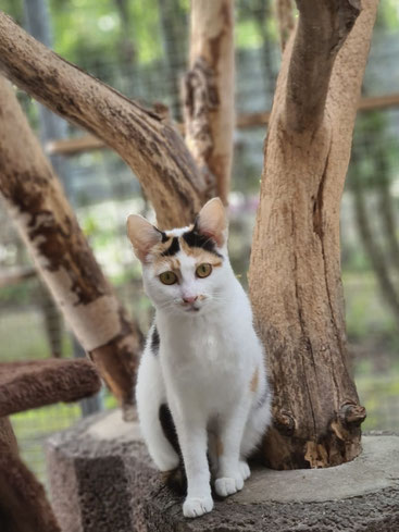 Sie ist eine ruhige und eher zurückhaltende Katze, die anfangs Zeit braucht, um Vertrauen zu fassen. Mit Artgenossen versteht sie sich gut, orientiert sich auch sehr an ihnen und würde sich über eine soziale, ruhige Katzenfreundin oder einen -freund im neuen Zuhause sehr freuen.